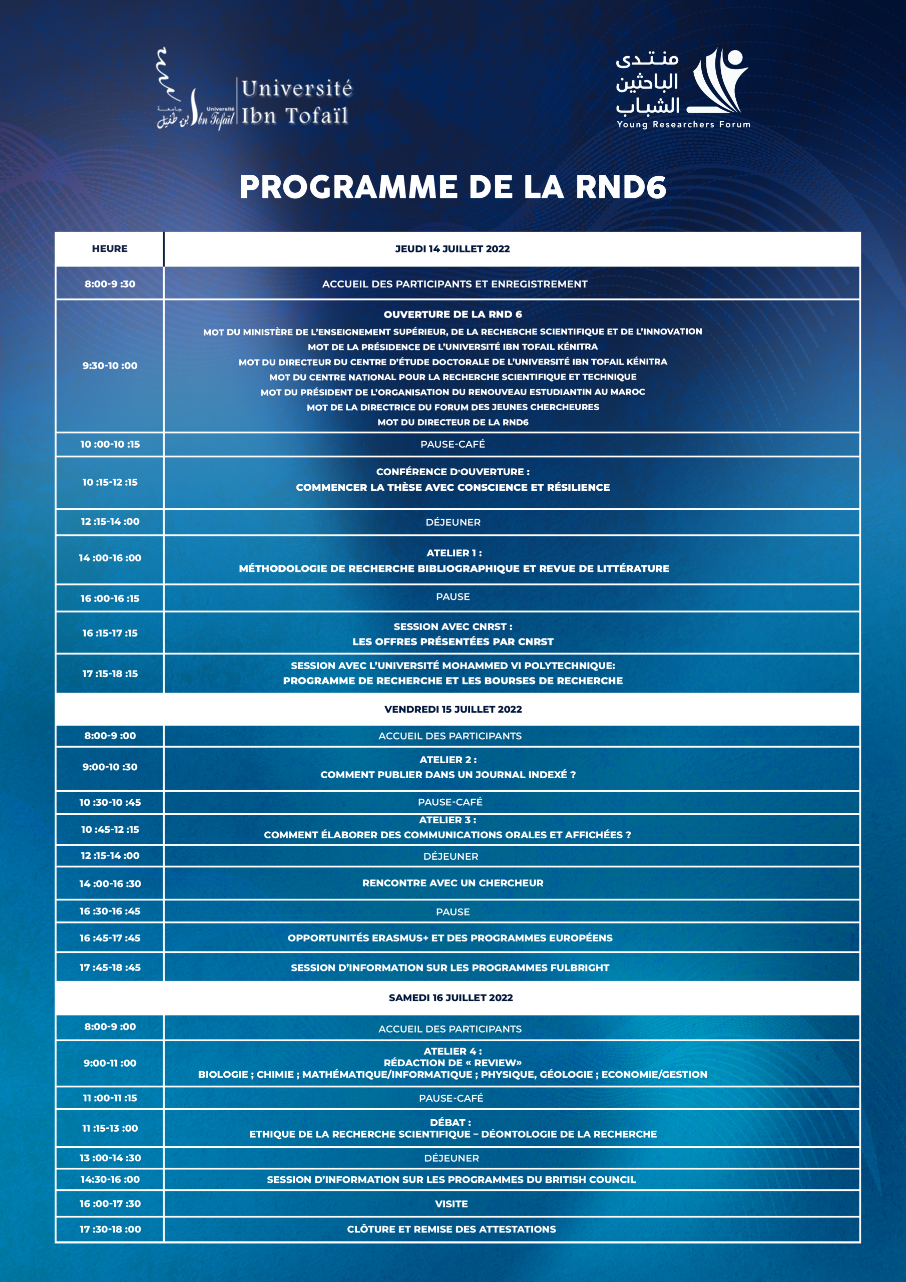 Le Forum des Jeunes Chercheurs, en collaboration avec l’Université Ibn Tofail de Kénitra, a organisé la 6ème édition de la Rencontre Nationale des Doctorants sous le thème « Pour une recherche scientifique productive ». L’événement à eu lieu du 14 au 16 juillet 2022, à partir de 09h30, au Théâtre de l’Université Ibn Tofail à Kénitra.