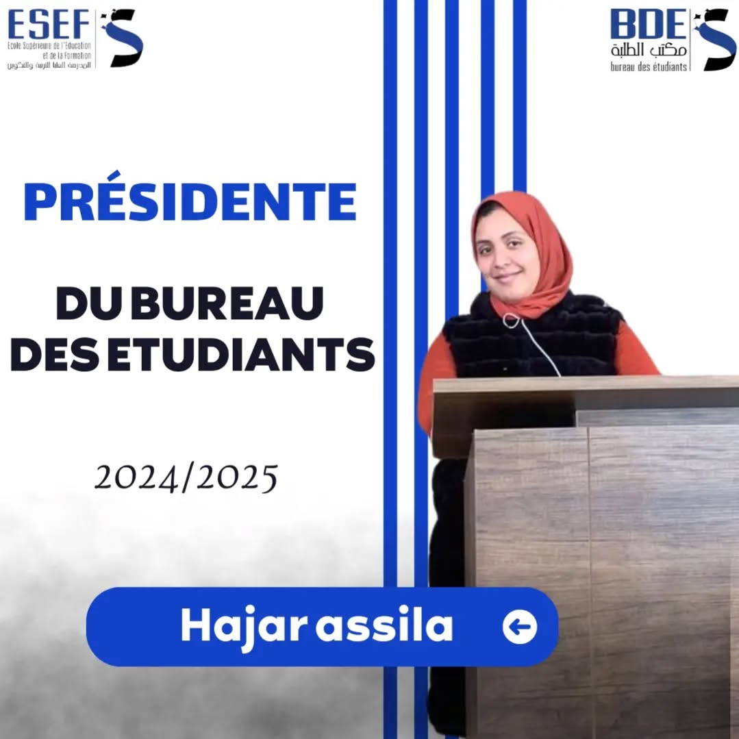 The Student Affairs Office of the Higher School of Education and Training in Kenitra has officially announced the appointment of Ms. Hajar Assila as the new President of the Student Office, following the completion of all regulatory procedures and consultations with relevant stakeholders. This decision reflects her outstanding leadership, strong communication skills, and active engagement in a wide range of student activities, through which she has consistently demonstrated commitment and initiative.